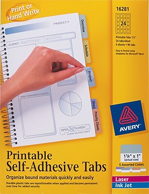 Avery 16281 Printable Plastic Tabs With Repositionable Adhesive 1 1 4 Assorted Pack Of 96