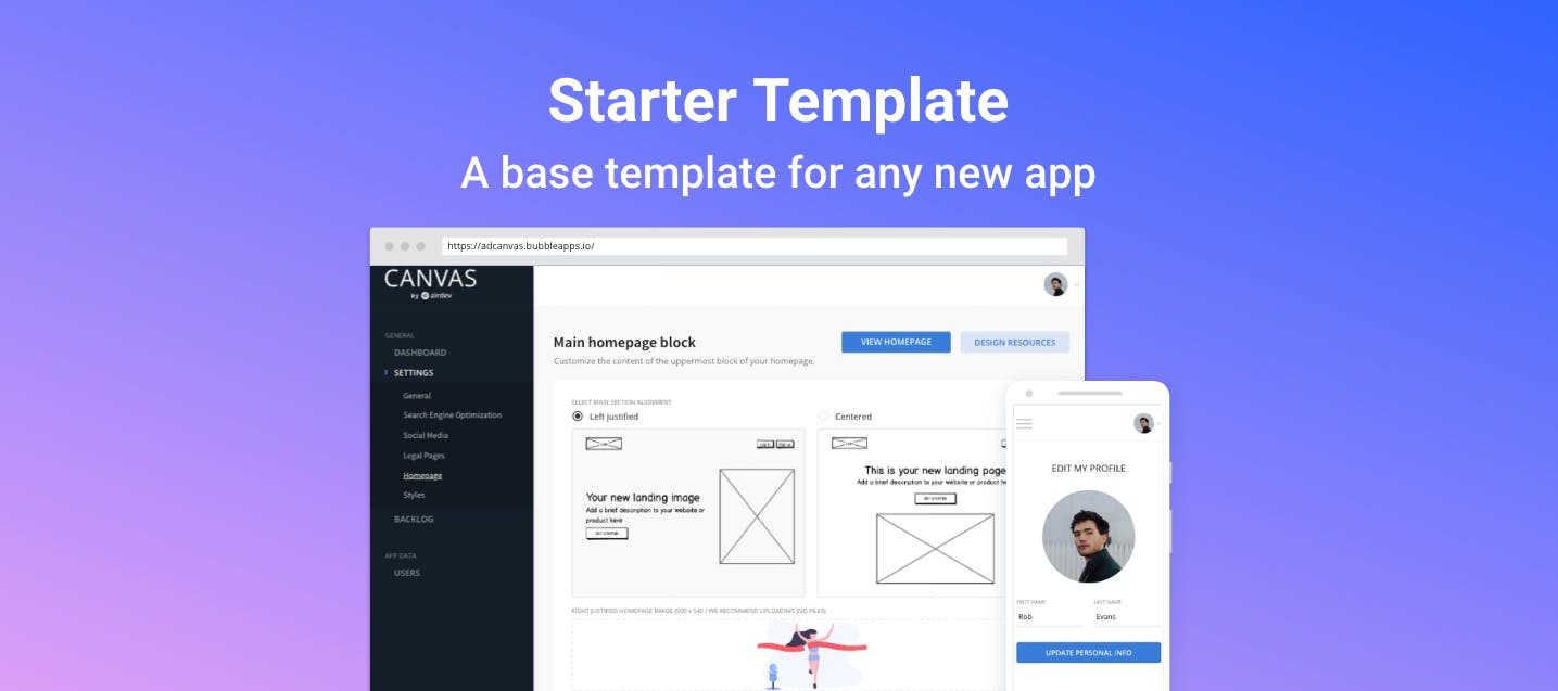 Bubble lets you build web apps without any code. Use this template to speed up your app development. Instead of typing code use a visual editor to build applications. Use this template to speed up your app development.