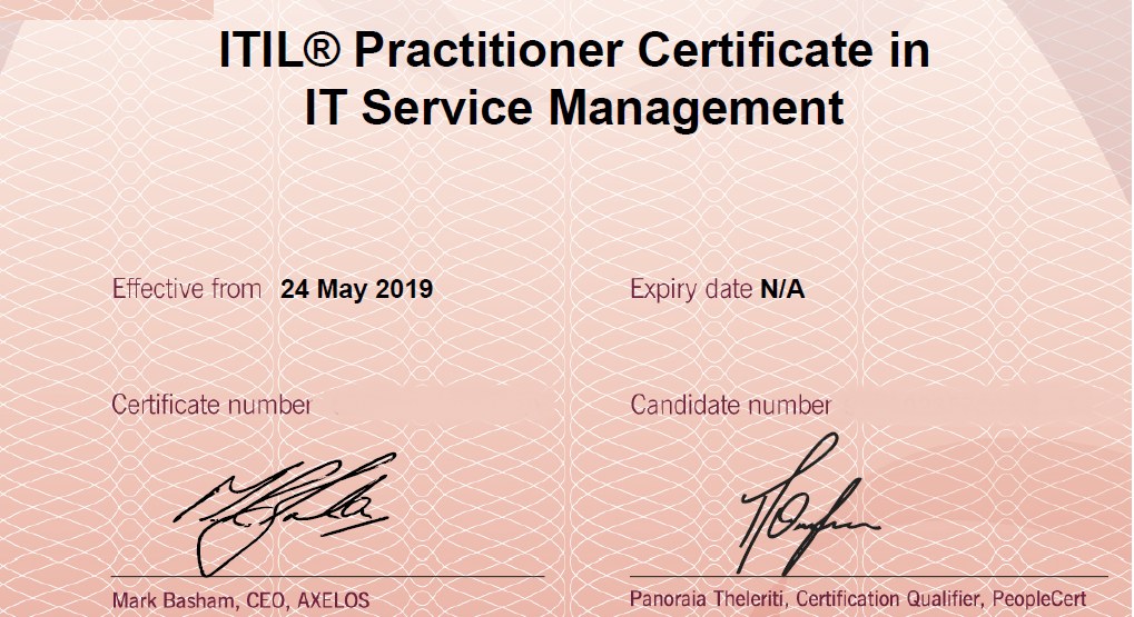Itil certification certificate. I wish i could get it for you but i cant. Itil is the de facto standard for it service management frameworks. Moreover the itil certification is the best among several other certification courses preferred by professionals of it service management because it provides basic knowledge about the concepts core principles and best practices used in it service management. Itil concepts are vendor neutral and address the processes terminology and methods used in modern it.