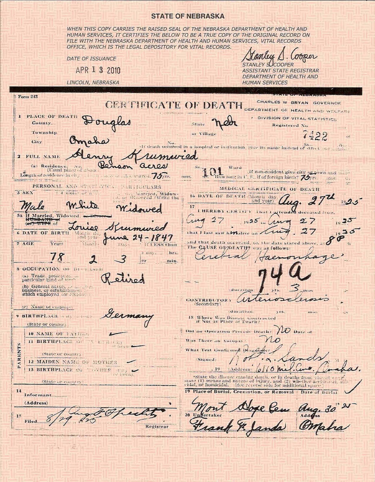 You can easily request for a death certificate to be legalized under the same order. For example the city of omaha has death records from 1873 and the city of lincoln has death files from 1889. Except for lancaster douglas counties for marriages before 1909 contact the county where the marriage license was filed or the nebraska state historical society. Nebraska did not begin statewide registration of death records until late 1904 and compliance was not complete for several years.