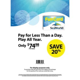 Costco cash cards are another convenient way to shop at our warehouses gas stations and online. Save 55 vs gate price on a 2 visit ticket. Buying a seaworld san diego gift on giftly is a great way to send money with a suggestion to use it at seaworld san diegothis combines the thoughtfulness of giving a gift card or gift certificate with the convenience and flexibility of gifting money. Buy a seaworld gift card.